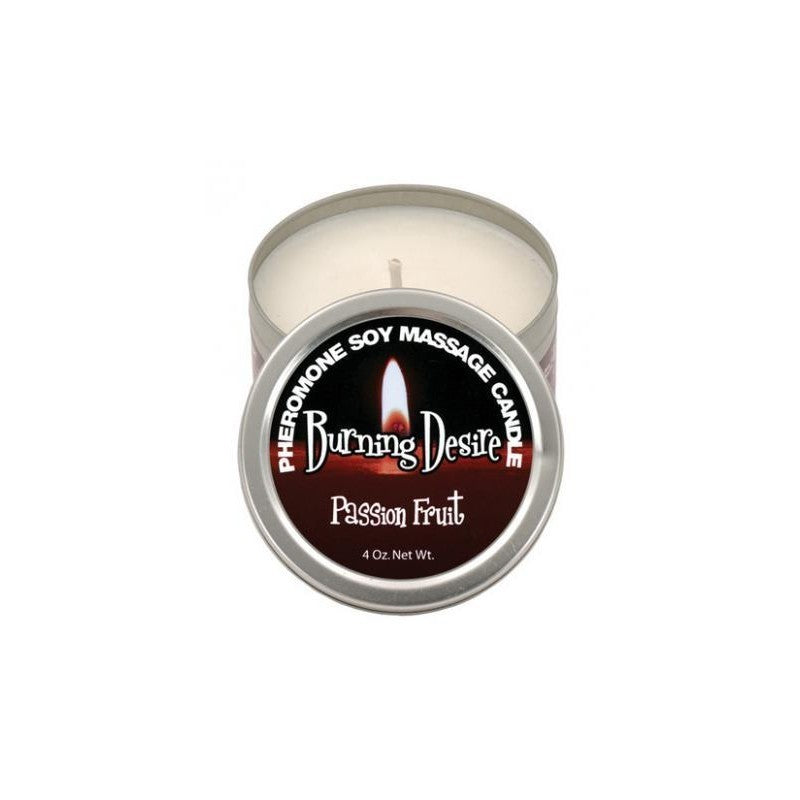 Find your passion with a Burning Desire Passion Fruit, Fragrance Candle. This massage candle not only sets the stage for a decadent massage, the unique massage oil candles contain pheromones for sensual arousal. The melting wax, made of gentle, skin-safe soy, transforms into a warm, deliciously scented massage oil.