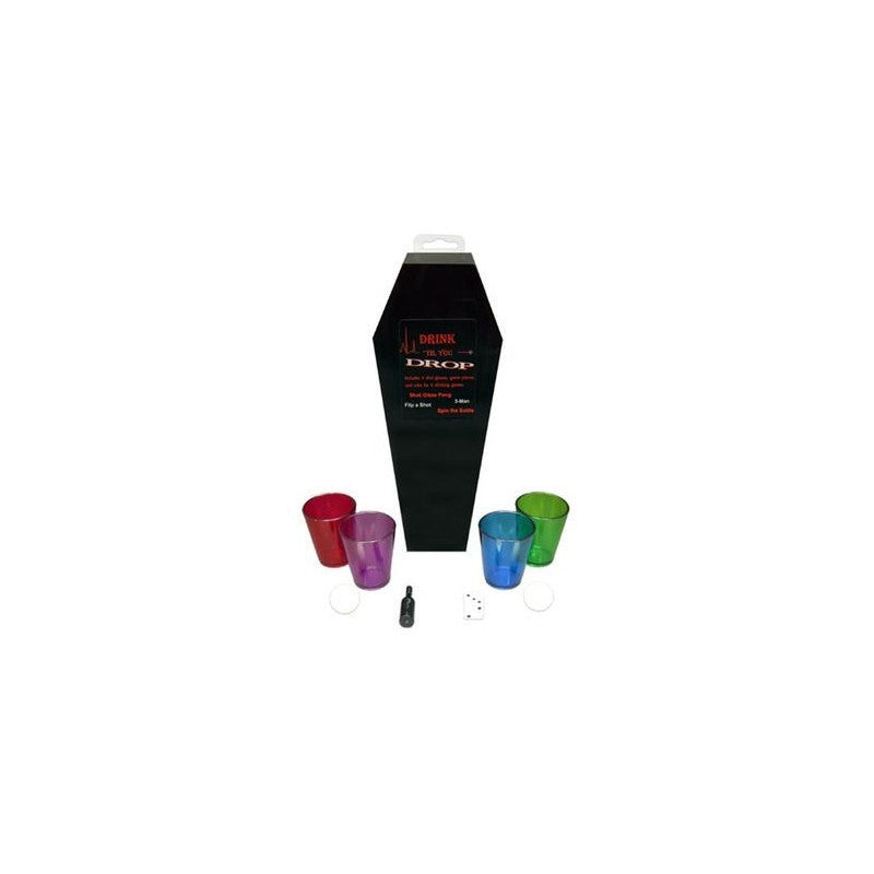 This coffin-shaped shot glass set is sure to Knock em dead at your next party. With this set you can play four entertaining drinking games. Shot Glass Pong Flip a...Product Details: